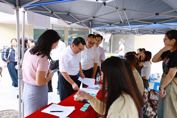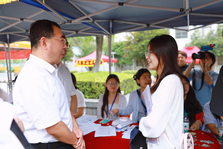 学校党委高度重视迎新工作。迎新当天,校领导深入迎新一线,详细询问新生报到流程、服务保障细节及应急方案落实情况,亲切慰问现场工作人员与志愿者,并与新生及家长亲切交谈,细致解答专业发展、校园生活等疑问,将学校的关怀与期许传递到每一位新生心中。