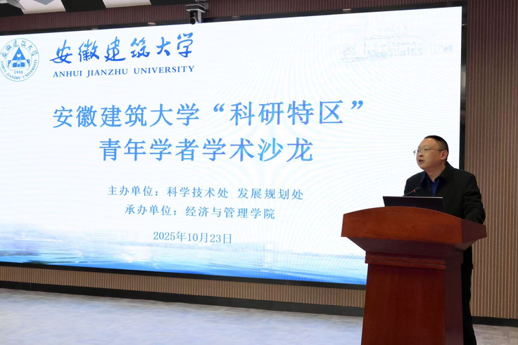 本网讯 10月23日下午,由科技处和发规处主办、经济与管理学院承办的“科研特区经管+”青年学者学术沙龙在徽智楼一楼报告厅成功举行。本次活动以“交叉赋能·精准预见:数字化浪潮下的绿色低碳与经济转型新范式”为主题,聚焦全球经济变革、数字化转型与可持续发展等关键领域,通过跨学科深度交流,打破学科界限,推动理论与实践的融合。学校党委常委、副校长高跃峰出席活动并致辞,科技处和发规处领导、经济与管理学院领导班子成员、相关学院科研工作者、学校在站博士后及在校博士生、硕士生共90余人参加活动,活动由经济与管理学院院长彭志胜教授主持。