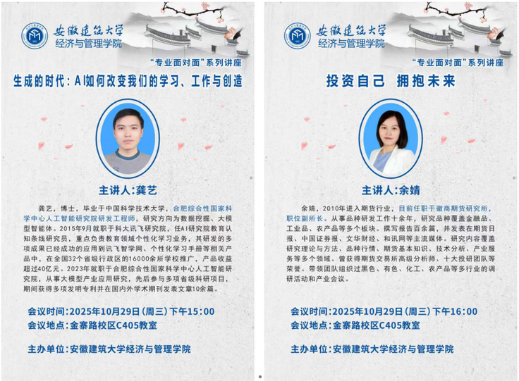 本网讯 10月29日下午,经管学院在金寨路校区C405举办2025级数字经济专业、金融工程专业校外导师“面对面”活动。学院邀请合肥综合性国家科学中心人工智能研究院研发工程师龚艺博士、我院优秀校友徽商期货研究所副所长余婧担任主讲嘉宾。学院院长彭志胜、专业系负责人、辅导员以及大一学生参加了本次讲座,讲座由经济学系副主任沈永昌博士主持。
