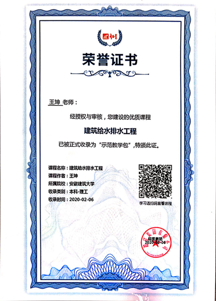 本网讯 近日,我院凌琪老师的《环境保护概论》、王坤老师的《建筑给水排水工程》和潘邦龙老师的《遥感基础与图像处理》三门慕课课程经超星公司专家评审,被收录为超星平台示范教学包,获得超星公司颁发的荣誉证书。