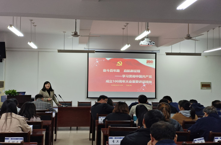 马晓艳以《奋斗百年路 启航新征程——学习贯彻中国共产党成立100周年大会重要讲话精神》为题,深刻阐释习近平总书记“七一”重要讲话的重大意义、主要内容和丰富内涵,对讲话中提出的新思想、新观点、新论断进行系统解读,并结合高校教育工作者实际,对如何着力推动习近平总书记“七一”重要讲话精神落实到行动上,与学院教职工进行交流探讨。