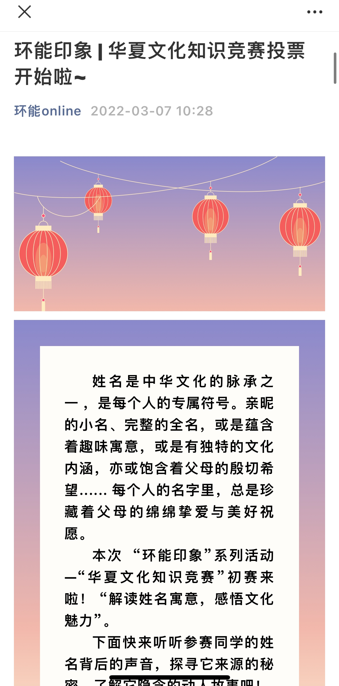 知识竞赛分为初赛决赛两个环节。3月1日至6日为初赛阶段,举办“解读姓名寓意,感悟文化魅力”为主题的线上活动,参赛选手对个人真实姓名寓意进行深度解读结合诗词、相关图片以及姓名的汉字拼音、汉字构造展开联想,撰写一段文字来解读姓名含义。所有参赛作品均在学院公众号“环能online”上进行了展示,并进行了线上投票活动,票数排名前十五名的选手晋级赛。