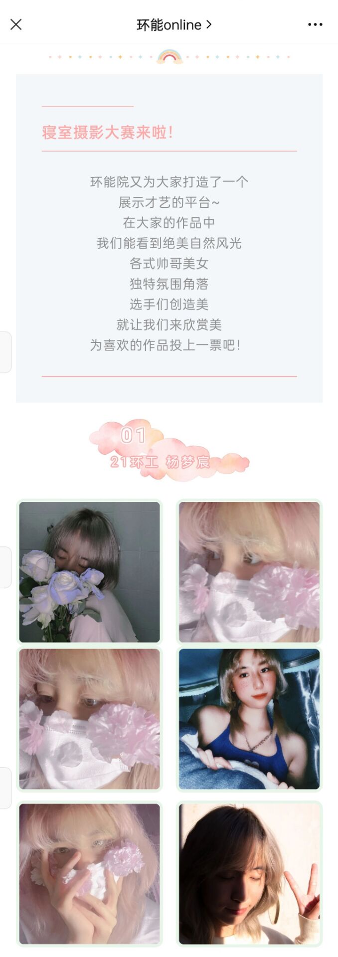 本次活动采用网络投票的方式进行线上评选,经过初步筛选的23组摄影作品入围决赛,并在“环能online”公众号上展出,进行线上评比。作品涉及内容广泛,有赏心悦目的校园美景,有深沉厚重的同学情谊,有轻松愉悦的寝室日常。同学们以校园为景,以室友为伴,以春光为饰,充分展示了疫情防控期间大学生积极向上的精神风貌,为阅读者带来了一场视觉盛宴。经过统计得票数,21建环李琦同学的作品摘得桂冠。