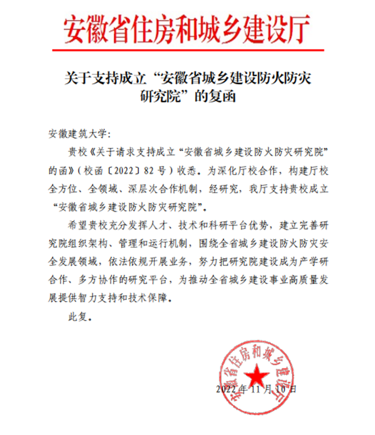 本网讯 近日,安徽省住房和城乡建设厅复函我校,正式批准我校成立“安徽省城乡建设防火防灾研究院”。
