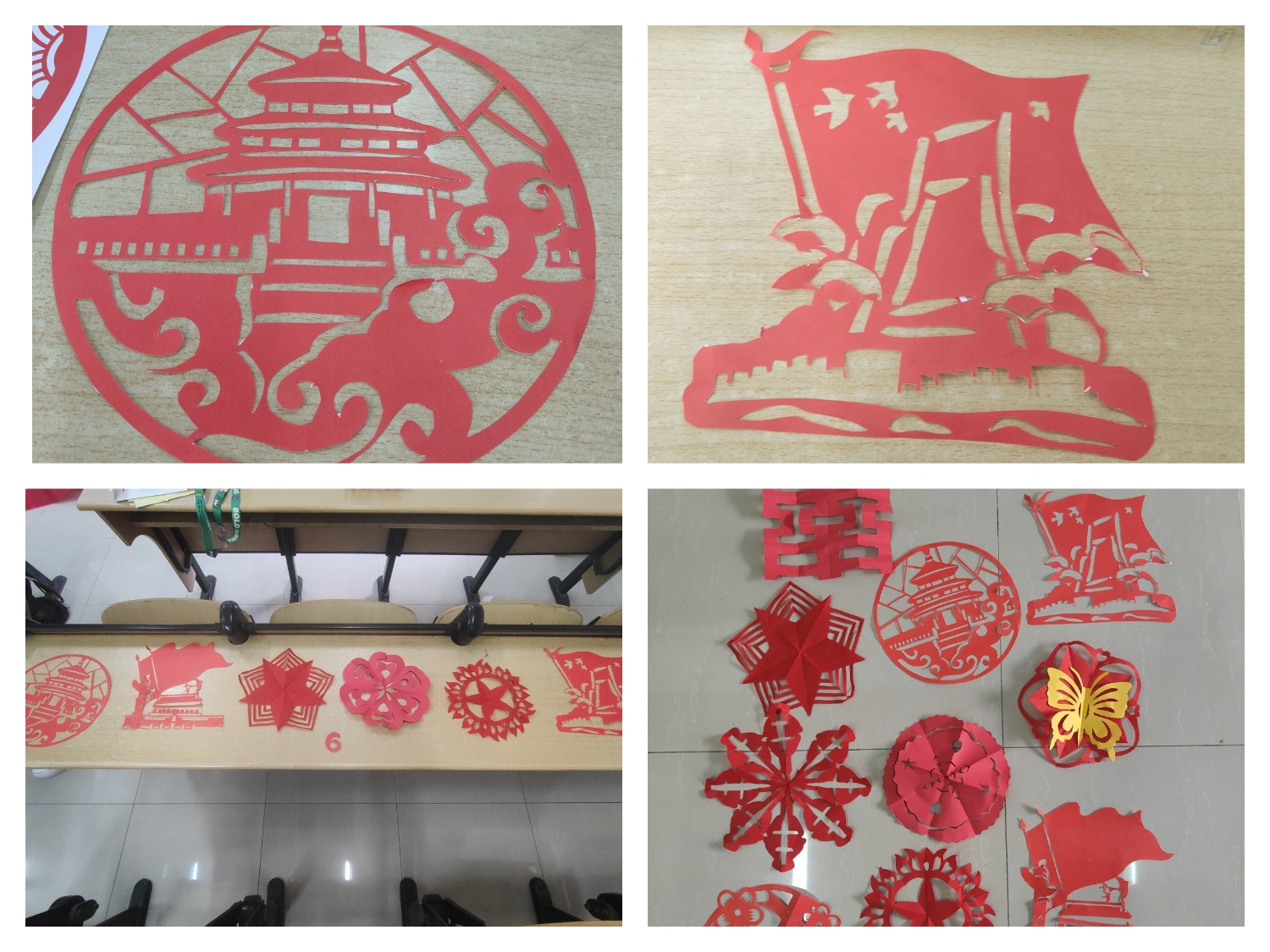 剪纸艺术作为中国非物质文化遗产的一部分,具有独特的审美价值和深厚的文化内涵。活动伊始,主持人向同学们介绍了剪纸悠久的历史,并展示了一些剪纸作品,精美的剪纸图案立刻激起了同学们的兴趣,大家迫不及待地拿起工具,按照主持人讲解的步骤开始行动。折叠,描边,裁剪,精心创作,同学们充分发挥想象力与创造力,勾勒出灵活多变的线条,一幅幅刻有“天坛”、“红旗”、“故宫”、“红星”等图样的作品顺利完成。通过本次活动,同学们得以近距离感受剪纸艺术的独特魅力。