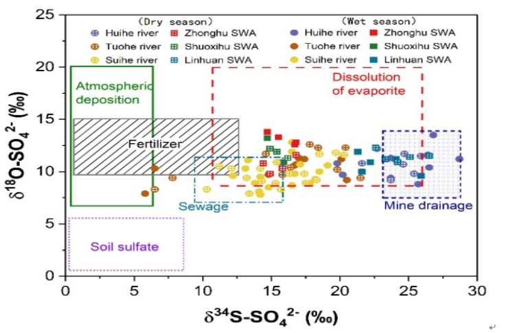 研究区旱季地表水中SO42-的总体浓度高于雨季,各种来源输入导致地表水中SO42-的富集,包括蒸发岩溶解、矿井排水、粪肥/污水和农业肥料。值得注意的是,矿井水的输入可以向河流贡献大量的SO42-,并控制其同位素组成。SO42-在地表水中的迁移转化过程相对保守,硫化物的非生物氧化和生物氧化作用相对较弱。本研究揭示了矿区周边地表水SO42-的多重来源和转化机制,为制定矿区SO42-污染的综合治理和有效修复策略提供了参考。作者:陈星;审稿:谢发之)