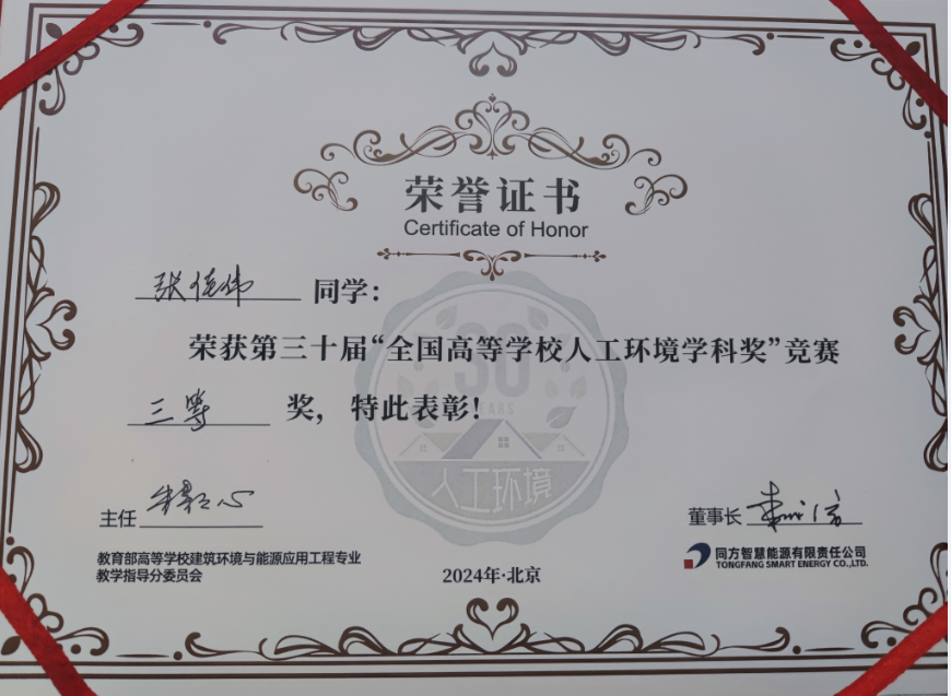 本网讯2024822日,第30全国高等学校人工环境学科奖专业基础竞赛(简称人环奖)颁奖典礼在清华同方科技广场举行。我校环境与能源工程学院建筑环境与能源应用工程专业2021级学生张佳伟荣获全国等奖。