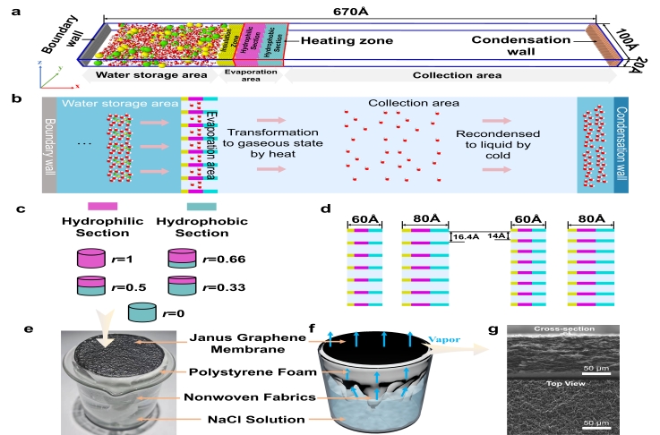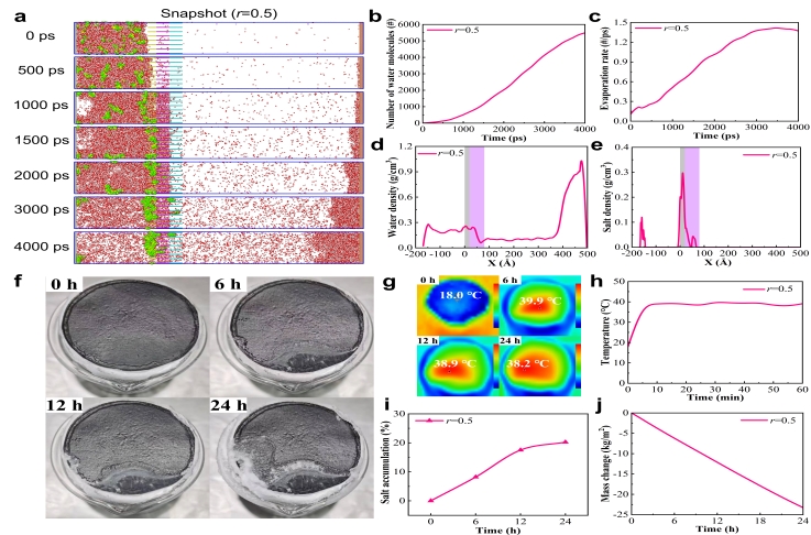 分子动力学(MD)模拟方法是研究热蒸发和分子输运等微观物理过程的有效工具,在探索Janus膜内部水分子蒸发和盐离子运输动力学这一尚未研究的领域上具有巨大潜力。本研究首次提出了基于MD方法的Janus膜纳米尺度界面蒸发模型。系统研究了不同疏水层比例、盐度、温度和通道几何参数下的界面蒸发和盐阻滞动力学。揭示了盐离子传输-沉积阻滞的复杂微观过程,并阐明了Janus结构的各项参数对于界面蒸发水平的影响机制。此外,还根据模拟结果制备了一系列非对称Janus石墨烯膜,并建立了Janus界面蒸发海水淡化实验系统。实验结果与模拟结果非常吻合,这印证了界面蒸发数值模型在微观层面上探索抗盐机理和改善蒸发性能方面具有巨大潜力,为提高光热材料的蒸发性能以及探究其传热机制提供了新思路。(作者:胡浩威 王津 一审:侯晓云 二审:黄健 三审:谢发之)