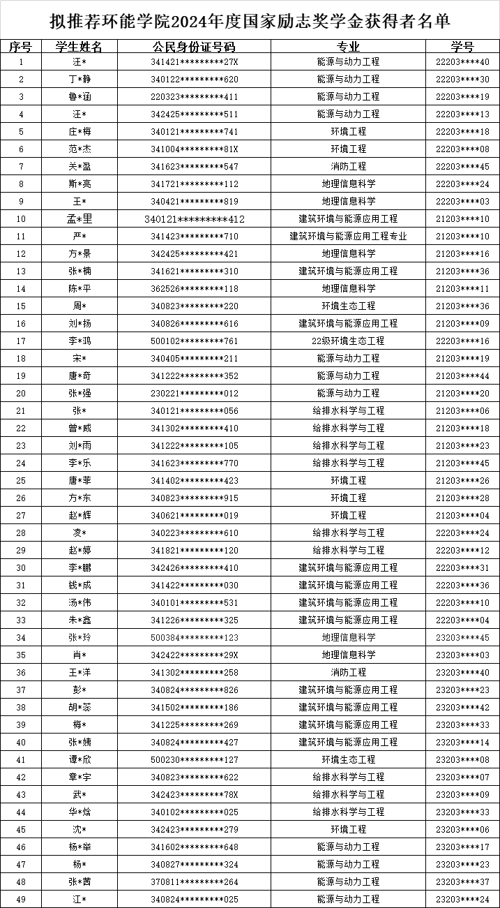 根据校学工部网站2024年9月9日发布《关于做好2024年度国家奖学金、国家励志奖学金及国家助学金评定工作的通知》要求,经个人申报,资格审查,学院评审委员会讨论、初审,拟推荐方*景等49名同学参评2024年度国家励志奖学金。