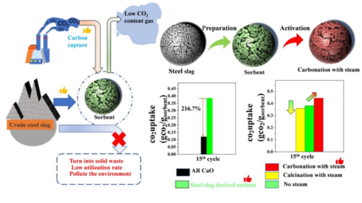 (3)固废源钙基固碳材料制备/再生:大宗钢渣固废较高的钙含量使其成为制备钙基二氧化碳吸附剂的合适前体。本研究对三种不同类型的钢渣进行乙酸浸出并制备钙基吸附剂。采用正交实验确定最有效的酸浸参数,采用蒸汽活化处理缓解钢渣吸附剂在二氧化碳捕获过程中的性能衰退。与试剂级氧化钙相比,钢渣衍生钙基吸附剂具有优越的碳吸收能力。此外,在碳酸化过程中加入蒸汽显示出减缓吸附剂反应活性衰减的潜力。以上成果由学院22级硕士生石秀良以“Optimized acid leaching synthesis and steam regeneration of the steel slag-derived calcium-based sorbent for enhanced CO2capture”为题发表在环境科学领域高水平期刊《Journal of Cleaner Production》(JCR一区,中科院一区TOP期刊,影响因子9.8)。