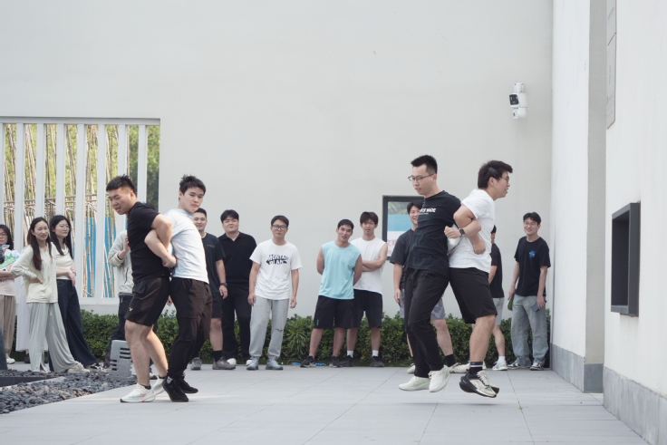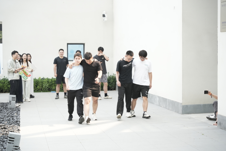 “五月榴花红欲燃,绿杨带雨垂垂重”。研究生两人一组,绑腿并肩,蓄势待发。哨响令下,各组迅速出击。或初时步伐凌乱,于欢笑中调整节奏,协力向前;或默契十足,步伐稳健,一路领先。现场加油声与欢笑交织,节日氛围浓厚。