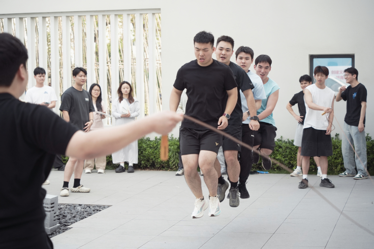 “彩线轻缠红玉臂,小符斜挂绿云鬟”。长绳两端,稳健摇动,绳影翻飞。中间四人,身姿轻盈,随绳跃动,节奏精准。绳子在空中飞舞,笑声和欢呼声交织在一起,整个赛场充满了欢乐和活力,成为端午佳节里一道独特的风景线。