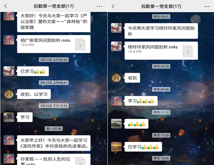 此次家风建设学习以线上学习的方式展开,支部党员将《清风传家》、《严以治家》家风建设读本录制成语音或视频,每日在支部学习微信群中分享,带领大家从获得国家级荣誉的英模党员事迹中,了解他们在家风建设方面的先进事迹。同时也从近年查处的腐败案件中,了解腐败分子腐化堕落与家风不正之间的深关联,以及家风败坏的危害和根源。认真学习体会读本蕴含的爱国爱家、敬业向上的深厚内涵,把中华传统优秀文化融入日常工作学习之中,切实落实立德树人根本任务。