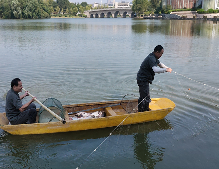 假期前一天,后勤物业中心组织员工在学校易海湖撒网捕鱼。在灼热的烈日下,物业员工划着小船一趟又一趟的在易海湖上打捞挂网的鱼供给各家食堂,汗水湿透衣背。