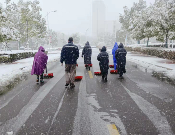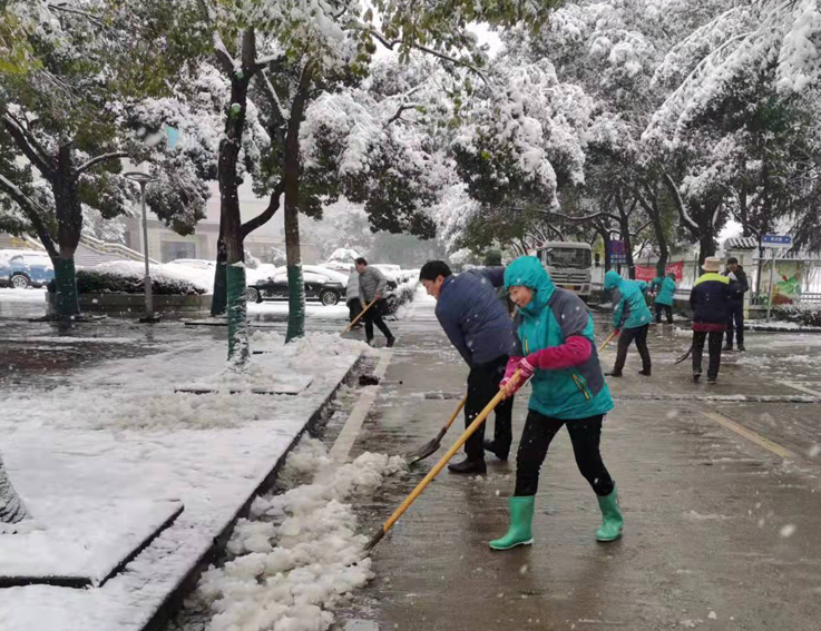2月6日夜间,合肥突降大雪,为方便师生出行,防止水雪成冰造成地面湿滑给出行带来不便及积雪压断树枝,2月7日一大早,校长黄显怀、副校长蔡新立带领后勤服务集团教职员工及物业服务人员,按照“以雪为令,边下边清,先主后次,雪停路通”的原则,在南北校区同时开展道路积雪及压枝积雪清除工作。