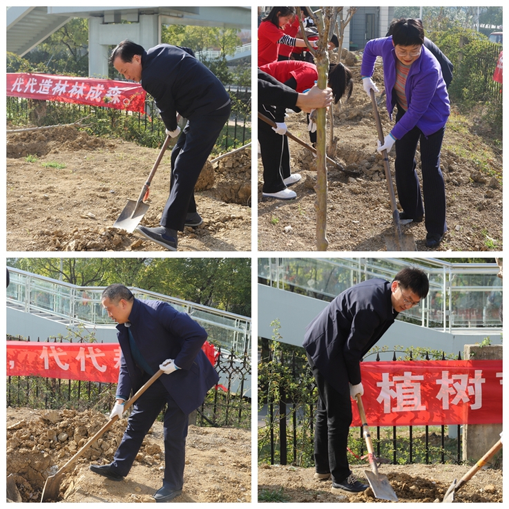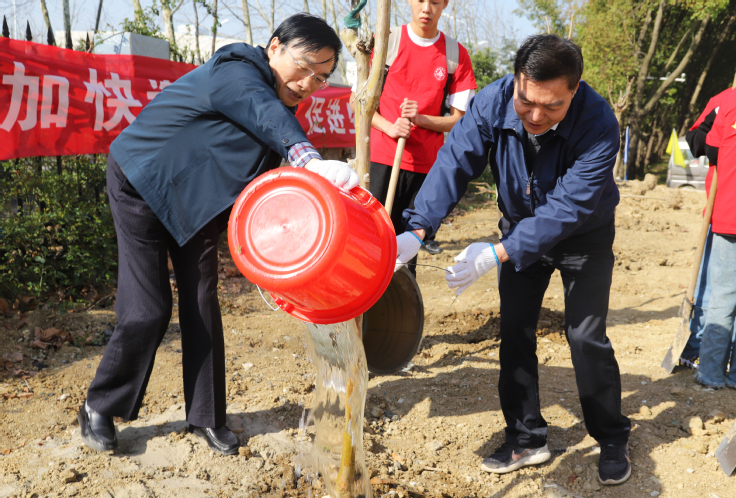 本网讯  又是一年春光好,植树添绿正当时。3月10日,在我国第44个植树节到来之际,学校组织师生在南校区开展义务植树活动。校党委书记孙道胜、校长黄显怀等校领导、各部门教职工代表、学生代表及志愿者按时到达植树现场。