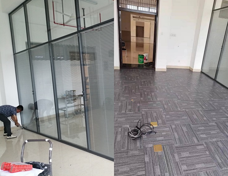 在艺术学院公共艺术空间实验室内,施工人员正在进行彩铝钢化玻璃百叶隔断安装及石塑地板铺设,努力改善基础设施及环境,为师生学习及工作提供了有力保障。