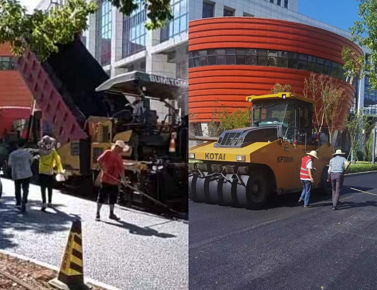 南校区土木楼西侧混凝土路面铺设沥青施工现场,施工人员正冒着高温天气,加紧施工完成修补工作,切实改善校园道路情况,为师生出行提供便利。