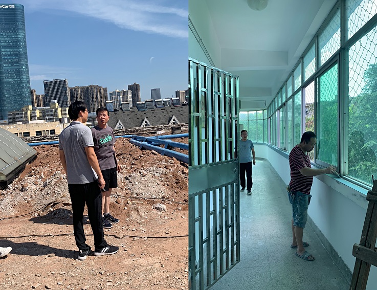 北校区F教学北楼等屋面防水整体翻修成教院E楼维修改造现场,施工人员顶烈日、冒酷暑,如火如荼进行维修改造,努力为新学期给师生创造一个良好的工作学习环境。