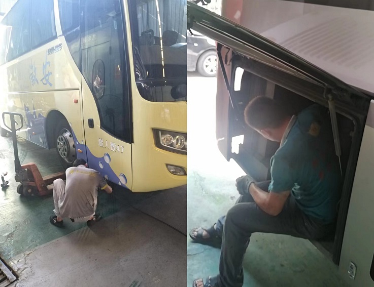 后勤服务集团校车队利用暑假时间集中检查车辆运行情况,由专业人员制动、转向、传动、轮胎、灯光系统和灭火器、安全带、安全锤等设施设备进行全面检查,对校车进行统一的保养,以便开学后乘车师生提供更加优质的校车服务。/图:张川;审稿:唐黎