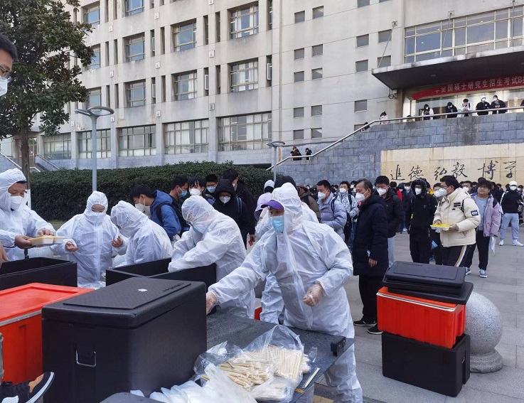 为保障研考期间的三千余名考生和近六百名考务人员的饮食需求,集团饮食部门精心安排,在考前多次和供餐企业对接确定供餐方案,既要保证饭菜质量卫生又要确保保温营养。面对考生和考务人员就餐相对集中,分餐时间紧的情况,饮食中心组织部门全体职工,并抽调二十多名食堂员工提前到岗,参与分发,确保每一份爱心午餐都能发放到每一位考生和考务老师的手中,让大家在寒冬中感受到人文关怀。