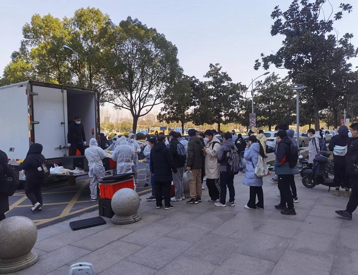 从12月21日开始,学校在校内为每一位考生提供免费“单人单管”核酸检测服务,后勤服务集团人员现场组织学生保持一米安全距离,有序完成检测,并为每一个考场配备乙醇消毒液、免洗洗手液、N95口罩等防疫物资,安排校医院的医务人员在考场值守,为考试途中出现身体不适的同学提供医疗服务,让同学们信心倍增。
