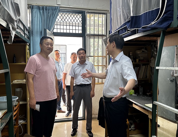 在学生公寓,实地查看了学生浴室及住宿环境,听取国资处负责人关于北校区规划方案的汇报。