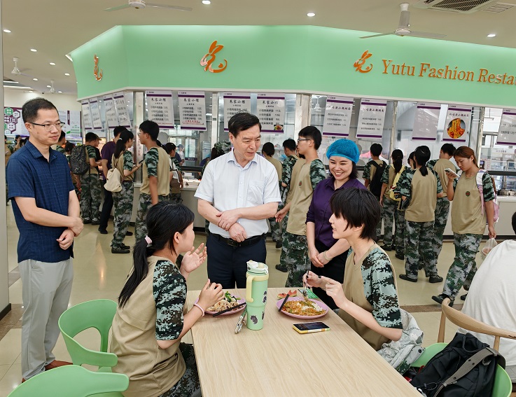 校党委副书记、校长黄显怀在节假日深入学生食堂查看就餐情况,和同学们亲切交谈,了解他们对食堂菜品和服务的满意度和诉求。