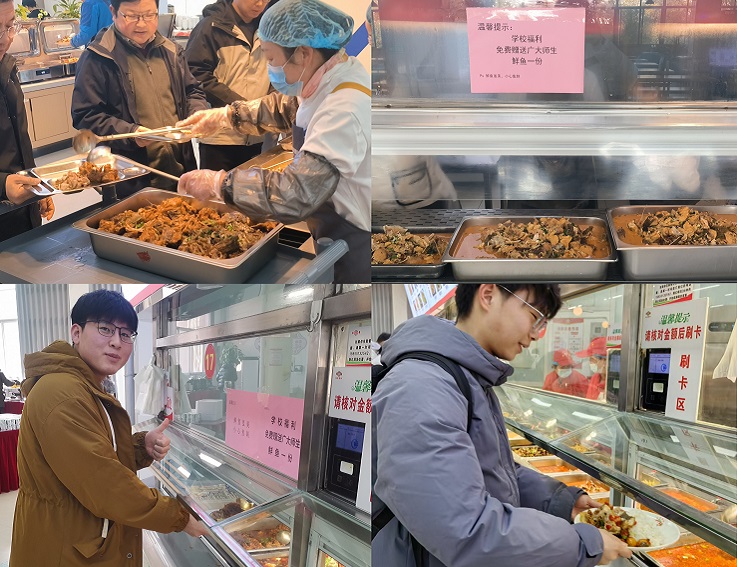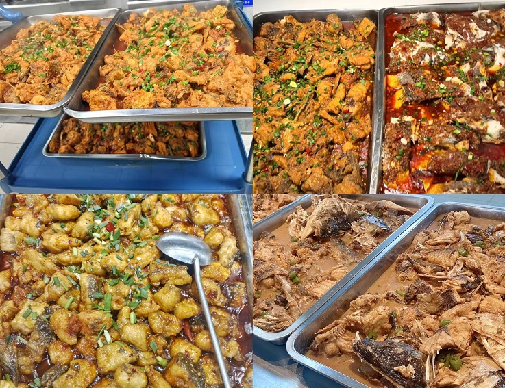 学校食堂员工则负责将捕捞上来的鱼运送至食堂进行加工。在食堂后厨,师傅们早已准备就绪,熟练地对运送来的鲜鱼进行加工处理。各家食堂精心烹饪的红烧鱼块、剁椒鱼头、香辣鱼块等美食免费供给师生品尝,吸引了许多师生前来尝鲜。