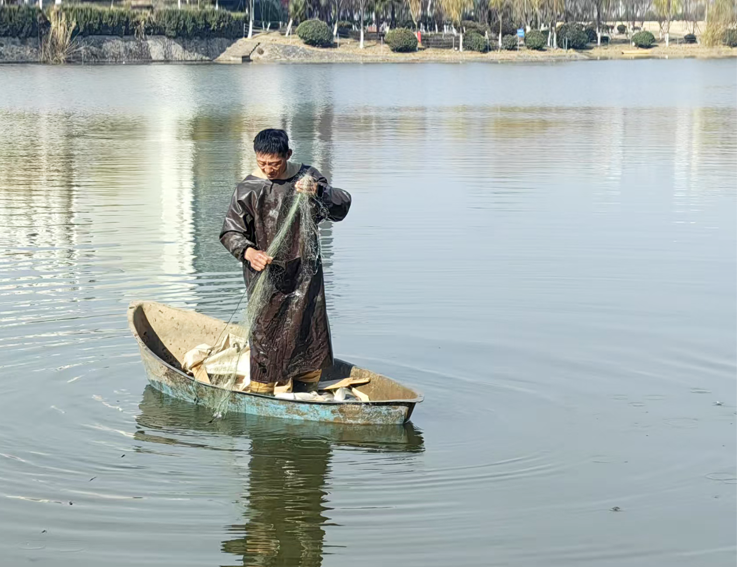 本网讯 日月其迈时盛岁新。为营造欢乐祥和的节日氛围,丰富师生的校园生活,在新年的第一天,后勤管理处组织专业人员在学校易海湖中进行捕鱼作业。