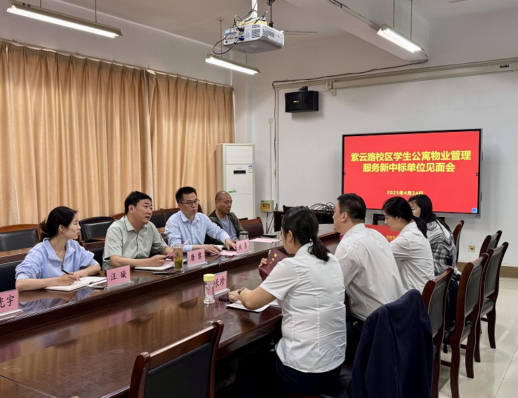 本网讯 4月24日上午,后勤管理处在紫云路校区组织召开学生公寓新中标物业管理服务公司见面会。后勤管理处相关负责人、公寓管理科工作人员、新中标物业公司安徽省长城物业管理有限公司法人代表、校园分公司总经理及项目经理等参加会议。