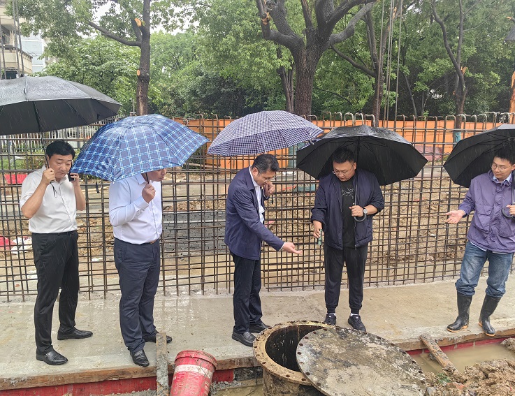 本网讯 5月8日下午,校党委书记马文革在校办公室、后勤管理处、水务集团、施工单位等相关人员陪同下,冒雨深入金寨路校区积水点治理现场,仔细查看全线贯通后箱涵排水情况。