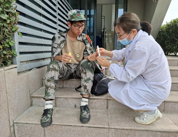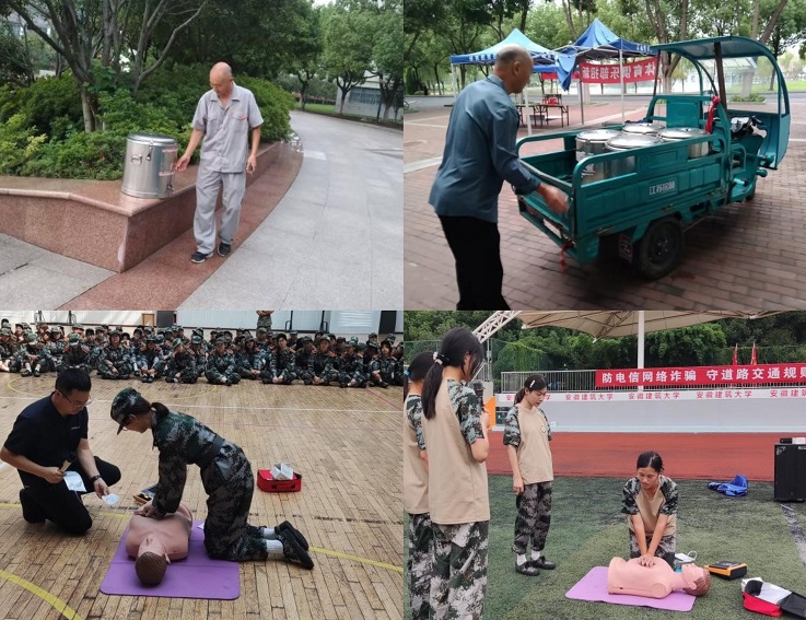 军训是新生入学的第一课,后勤各项服务保障贯穿始终,保洁团队每日清晨便对军训主看台、训练场及周边公共区域进行全面清扫,确保训练环境干净整洁。针对军训期间学生饮水需求,保障团队在训练场周边增设多个开水供应点,安排专人定时巡查、及时补水,让参训新生随时能喝上放心、温热的开水。校医院更是将医疗服务送到军训一线,派出医疗小组驻守训练场,为军训中出现中暑、擦伤、肌肉拉伤等情况的学生提供及时救治和健康指导。军训期间,医疗保障团队累计服务师生1300余人次。军训期间组织新生开展有关使用心肺复苏(CPR+AED的急救培训,共培训场次10次,有效提升新生应对突发健康事件的能力。