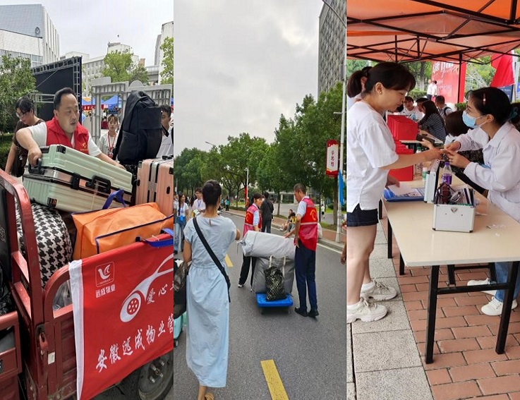 新生报到期间,后勤管理处设立多个迎新服务导台,志愿者身穿红色马甲,提前到岗到位,热情为新生及家长提供咨询引导、行李搬运等服务。校医院同步在各迎新点派驻经验丰富的医生和护士,设立临时医疗服务站,配备常用药品和急救设备,随时待命处理新生及家长可能出现的身体不适等突发状况,以专业的医疗保障为新生入学保驾护航。