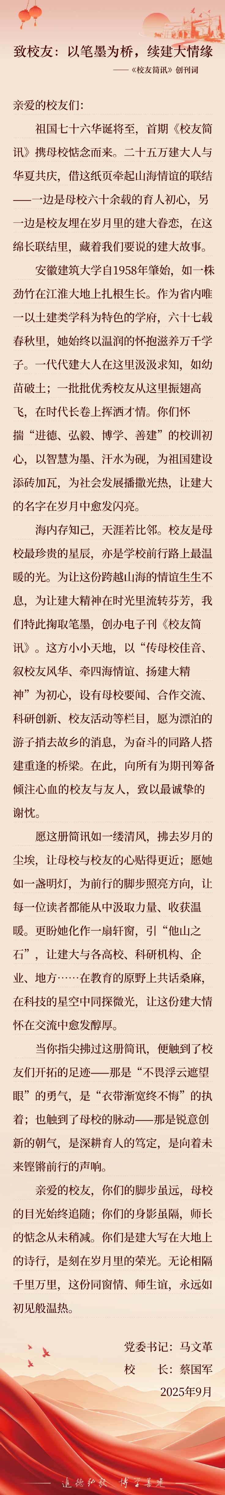 一纸简讯,是牵挂的载体,更是前行的号角。愿这方寸屏幕间的文字与影像,能传递母校的温暖与力量,凝聚建大人的智慧与情怀。值此家国同庆之时,让我们以简讯为桥,心手相牵,在各自的岗位上续写“建大人” 的精彩篇章,共同见证母校与祖国的繁荣昌盛!