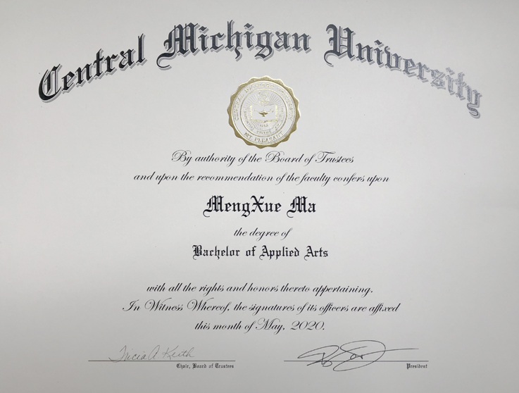 艺术学院学生获得美国中密歇根大学应用艺术学士学位
