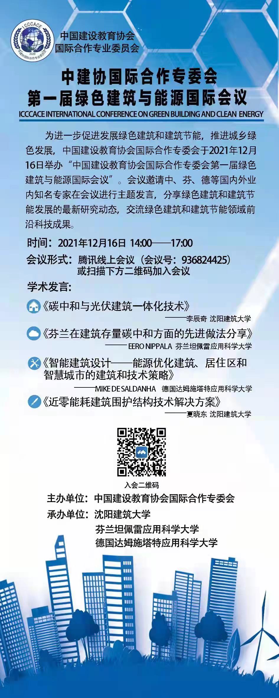 为进一步促进发展绿色建筑和建筑节能,推进城乡绿色发展,中国建设教育协会国际合作专委会于2021年12月16日举办“第一届绿色建筑与能源国际会议”。会议邀请中国、芬兰、德国等国内外知名专家(附件1:专家简介)进行主题发言,分享绿色建筑和建筑节能领域前沿科技。