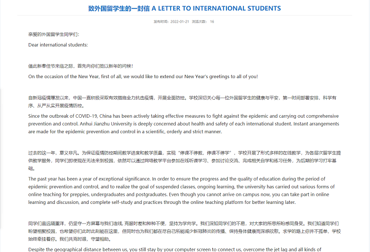 为安抚疫情下境外留学生彷徨与焦虑的情绪,坚定其为学向学的信念,国际交流合作处于期末考试后贴心地写给境外留学生一封信。收到信的留学生感到十分欣喜,表达了对中国、对学校以及授课老师们的深深的感激,并表示期待早日来华入境、相聚校园。
