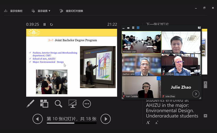丁湘代表国际处向美方参会人员介绍了我校发展概况、办学特色与优势,以及近年来我校国际交流合作的总体情况,并详细介绍了我校与美国中密根大学开展的3+1合作办学本科教育项目及与美国加州大学河滨分校开展的3+1+X学生交流项目,同时对与美国阿克伦大学开展具体合作交流项目提出建议和展望。视频会上,材化学院副院长张峰君教授和环能学院李卫华教授分别代表各自学院介绍了学科发展概况以及在教学、科研、学术交流、人才培养等方面所取得的成绩,并对与美国阿克伦大学就科研合作与交流提出具体想法与建议。