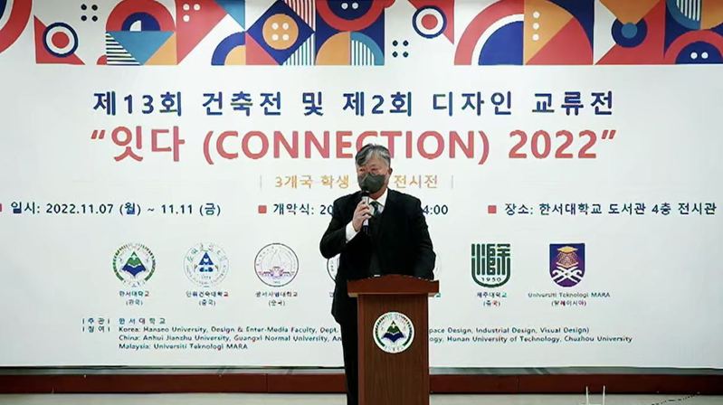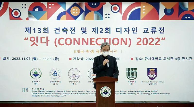 本网讯 由韩国韩瑞大学举办、我校协办的第十三届大学生国际建筑设计作品展及第二届设计交流展,于2022年11月7日在韩国韩瑞大学举行开幕式,韩瑞大学副校长金镇宇博士、艺术学部部长魏光哲教授、我校建筑与规划学院副院长顾康康教授分别在开幕式上致辞,我校建筑与规划学院、艺术学院的15副学生作品(建筑学5副、室内设计5副、视觉传达5副)在韩瑞大学展览馆展出。