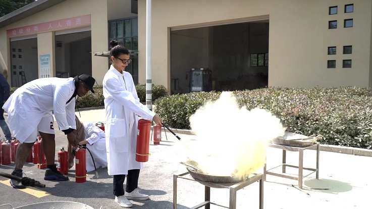 疏散演练活动结束后,国际学生来到灭火演练指定地点,学习灭火基本方法、常用灭火器及使用方法、灭火要领等知识。在专业人员的指导下,全体国际学生都学习使用灭火器进行了灭火演练。