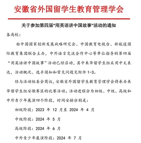 安徽省外国留学生管理学会承办来华留学生组安徽赛区的比赛活动。活动将分为初级阶段、中级阶段、高级阶段,经过各阶段展示脱颖而出的选手将于20247月汇聚最后的中外青少年展演。
