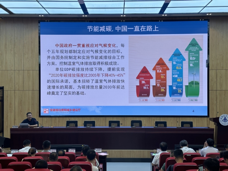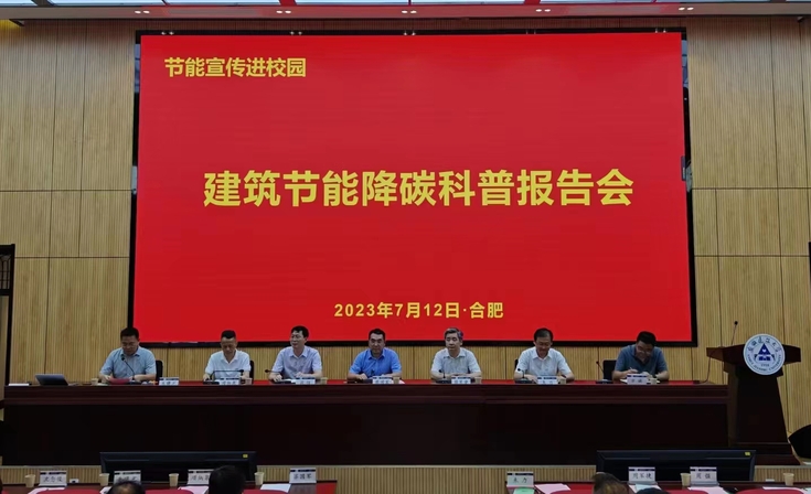 本网讯 节能宣传进校园,低碳发展讲科普。7月12日,在安徽省住房城乡建设厅指导下,我校联合安徽省建筑节能与科技协会承办了建筑节能降碳科普报告会。校党委常委、副校长蔡国军出席会议。省住房城乡建设厅建筑节能与科技处副处长朱力和胡浩威、省科技厅社发处二级调研员周军捷、三级主任科员王孝文、省发改委环资处副处长周强、省机关事务管理局一级主任科员方诚、省建筑节能与科技协会会长项炳泉、副会长叶长青,以及省节能与科技协会会员代表和学校师生共150余人参加了科普报告会。
