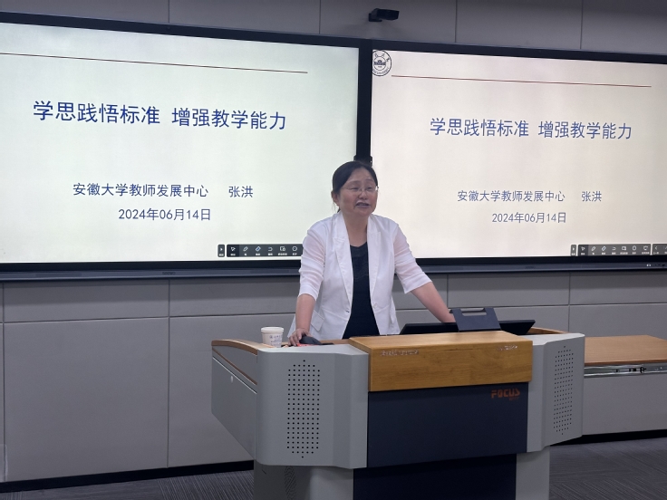 本网讯 为扎实有效提升新入职教师教育教学基本素质,锤炼教师教学基本功,促进年轻教师完善自我,提升能力,6月14日下午,教师发展中心特邀请安徽省教学名师、安徽大学教师发展中心主任张洪教授作《学思践悟标准 增强教学能力》专题讲座,讲座由教师发展中心主任段宗志主持,报名2022年、2023年新入职岗前培训以及广大感兴趣老师参加。
