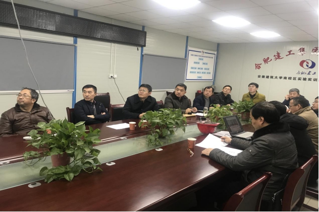 在施工现场项目部会议室,方潜生一行听取了施工、监理单位的项目建设及春节前、后施工进度计划的情况汇报。杨晧东代表合肥建工集团对实验实训综合楼项目争创鲁班奖工作开展情况进行了详细介绍。