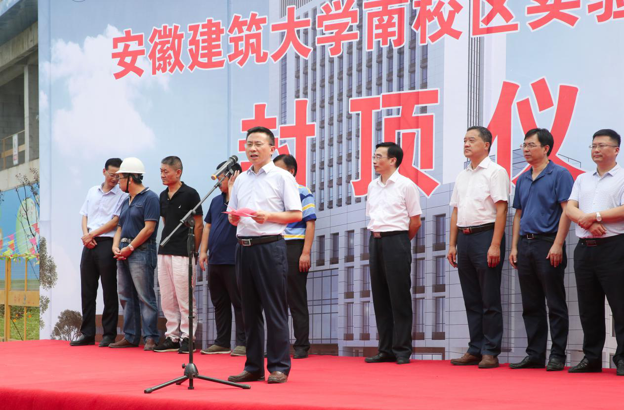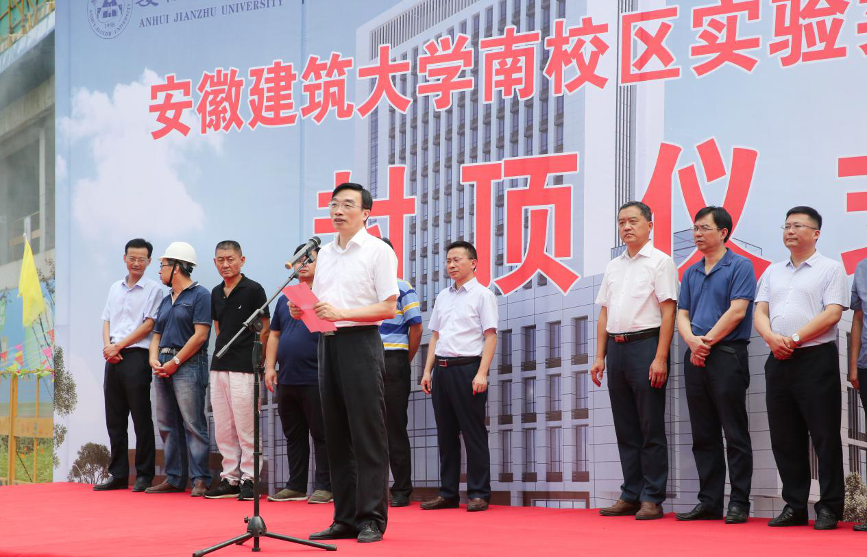 本网讯 8月28日,由合肥建工集团有限公司承建的我校南校区实验实训综合楼项目全面实现结构封顶,校党委副书记、校长孙道胜,合肥建工集团有限公司总经理朱海生出席封顶仪式,施工、监理、设计、勘察单位、学校相关部门负责人参加仪式。
