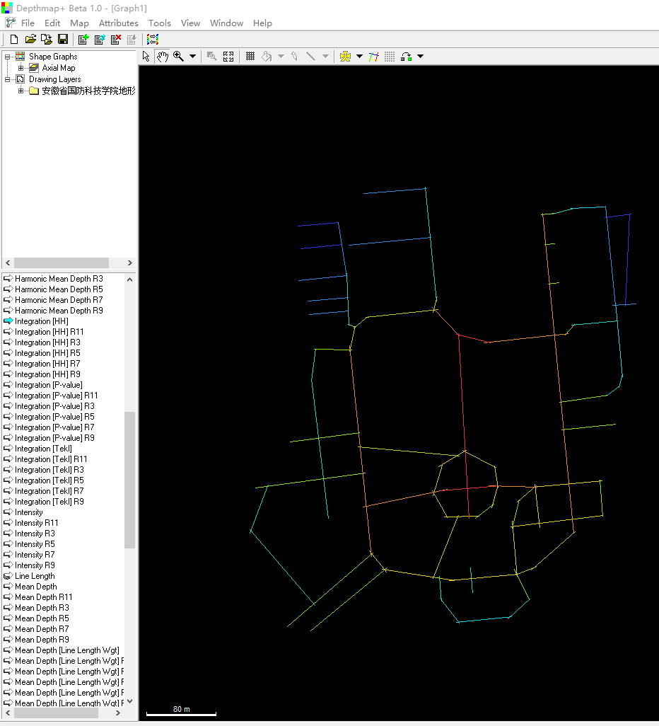 以下面轴线分析的图为例,轴线的颜色越暖说明轴线所代表路径的整合度越高,即这条路径在整个系统中的可达性越高。轴线的整合度随着红橙黄绿青蓝紫颜色的变冷而降低,表示相应的路径在整个系统中的可达性也随着降低。中间的十字型交叉路径整合度最高(整合度值1.55),可达性也最高。而北侧的末端路径呈整合度低(整合度值0.51)的蓝紫色,说明这些路径在可达性偏低。(见图一)