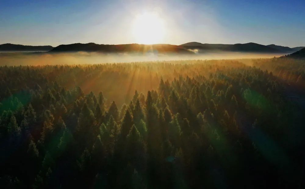 塞罕坝国家森林公园晨景(2021年6月27日摄,无人机照片)。