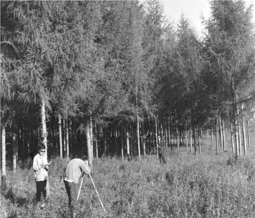 林业调查队员在塞罕坝林场进行森林调查(20世纪80年代资料照片)。