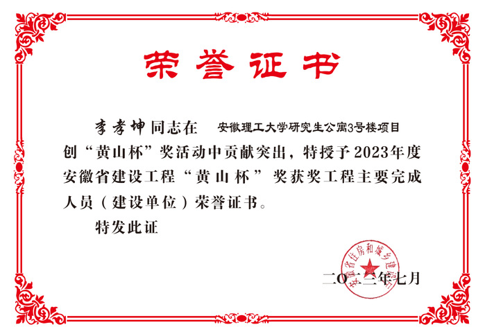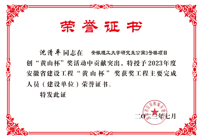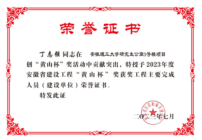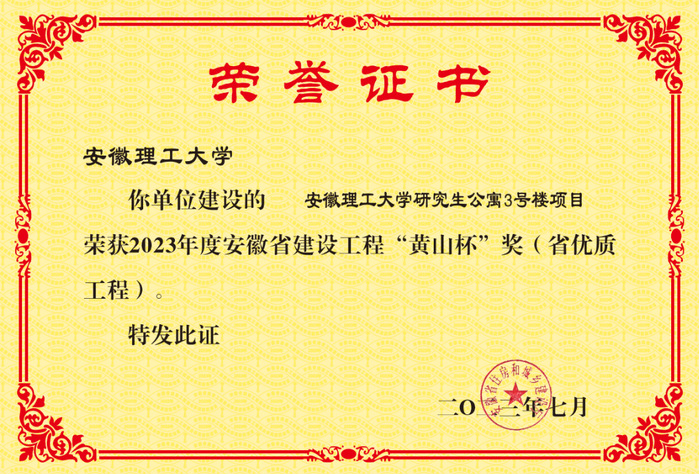 本网讯安徽理工大学研究生公寓3号楼项目荣获2023年度安徽省建筑行业建设工程质量最高荣誉奖“黄山杯”(省优质工程),学会会员丁志强、沈清平、李孝坤作为项目主要完成人受到表彰。